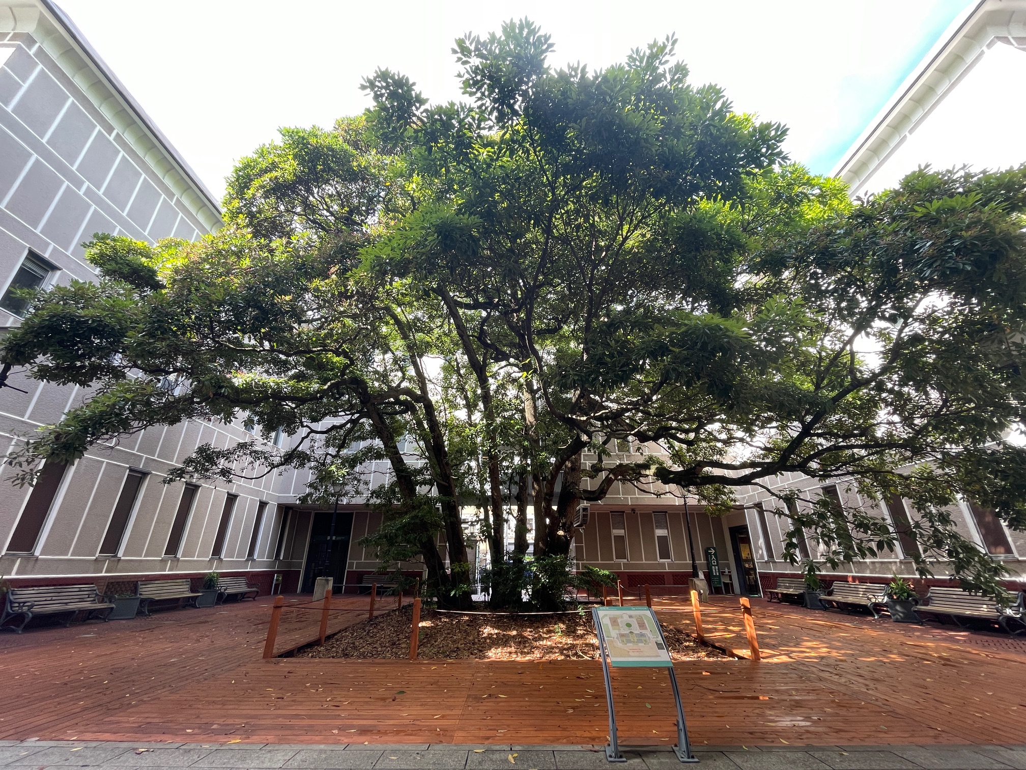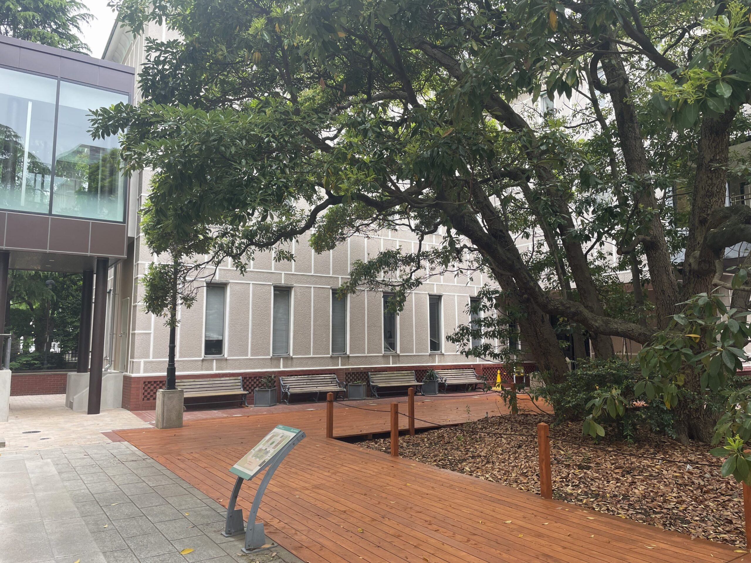 横浜開港資料館の中庭にあるタブノキは、通称「たまくす」と呼ばれています(1)。