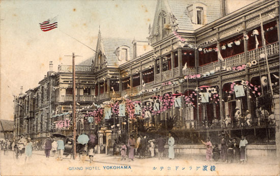 グランド・ホテルは、明治3年(1870)にグリーン夫人によって開業され、明治6年、堀川沿いの居留地20番地(現在の横浜人形の家の位置)に石造りのホテルがオープンした。その後、明治23年(1890)には、隣接地の居留地18番と19番地にP・サルダ設計による新館が増築された。関東大震災で倒壊するまで、横浜を代表するホテルであった。