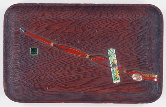 蓮杖の米寿の祝いの宴で配られた扇子(前田正隆氏寄贈・当館蔵) - 下岡蓮杖の杖をあしらった盆