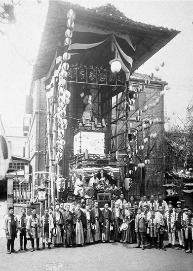 明治3(1870)年4月14日、伊勢山皇太神宮が、新興のまち横浜の総鎮守として遷座されました。その際、貿易商人らによってつくられた「本町の山車」4台は、台座に人形を置く江戸型の山車で、その高さは7~8メートルにおよぶ巨大なものでした。吉田新田の鎮守である日枝神社(お三の宮)の山車も、関外の市街地化にともなってつくられた江戸型の山車で、当時の写真や絵はがきのなかに確認できます。