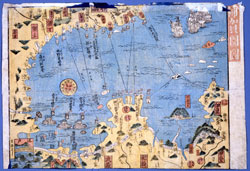 嘉永7年(1854)頃の東京湾・相模湾の「海防」(=海岸防備)の状況を示す絵図。画面左下に江戸、下部中央に浦賀が先端として配置されている三浦半島、右下に伊豆半島が、それぞれ描かれている。上部が房総半島になる。左下の江戸へ向けて、右上よりペリー艦隊が来航する構図。