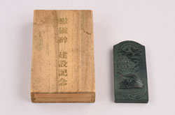 慰霊碑の形を模した記念品。横浜地方裁判所前の慰霊碑建立の際につくられた。表面には、地震発生の時刻である午前11時58分を示す時計と、倒潰した旧裁判所の庁舎、さらに判事がかぶる帽子が表現されている。また、裏面には、「慰霊碑 建設記念 昭和十年九月一日 横浜」と記されている。