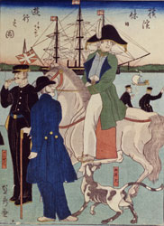 幕末の浮世絵師貞秀は多くの洋犬を描いた。しかし、犬だけの絵はない。いつも人とともに描かれた。貞秀の絵筆を走らせたのは、耳が垂れて足の長い洋犬それ自体だけでなく、当時の日本人の目には珍しい、外国人と犬との関係だった。