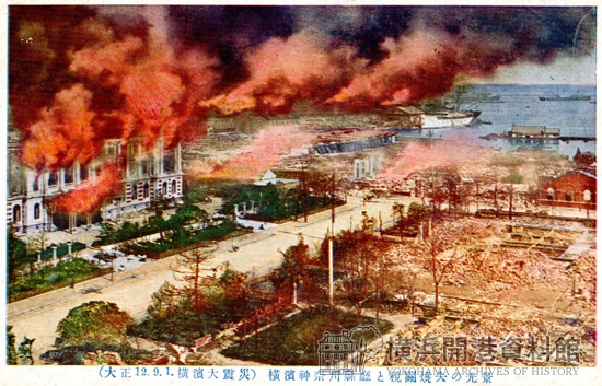 シリーズ「大正12.9.1 横浜大震災」の1枚。横浜中央電話局新庁舎から日本大通り、神奈川県庁や新港埠頭方面を撮影している。神奈川県庁は赤々と燃え、新港埠頭は煙に包まれているが、日本大通りには、平然と歩く人影も確認できる。この絵葉書は被災地の写真に炎を書き加えた上で、着色したものである。当初、関東大震災関係の絵葉書は飛ぶように売れたが、人々の関心の低下とともに、次第に過剰な演出がなされていった。