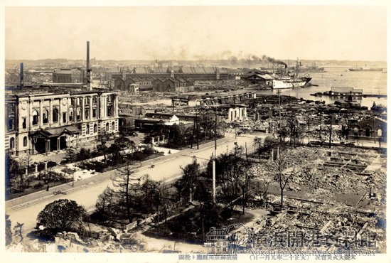 図1 横浜 神奈川県庁と税関焼失の光景 1923(大正12)年 当館蔵