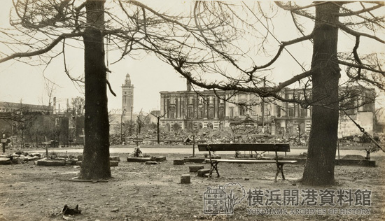 イギリス総領事館の構内(当館所在地)から、焼失した神奈川県庁舎の残骸を望む。2本のヒマラヤスギ(当館西門のところに現存)の先には、震災で亡くなった領事館員が仮埋葬された墓が並んでいる。奥には、倒壊をまぬがれた開港記念横浜会館(現・横浜市開港記念会館)の時計塔も写っている。