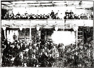 『横浜貿易新報』は、1915(大正4)年に25周年をむかえ、2月28日には5000号に達した。そこで5月1日から7日までを祝賀期間と定め、連日祝賀大会を開催するとともに記念号を発行した。青年大会は、「地方元気の泉源たる各地青年会代表者を一堂に会し以て其の胸襟を開き兼ねて先覚名士の教訓に浴せしめ」ることを目的に、端午の節句である5日に開催された。6日付本紙1面に「県下青年の雄 郷党を代表して金港に集り 一堂に相会して襟懐を開き 三渓の勝に悠々浩気を養ふ」という見出しを掲げ、青年大会の概要を紹介している。大会は横浜演舞館(現在、中区本牧)で行なわれ、景勝地三渓園での昼食をはさんで講演会が開催された(図1)。