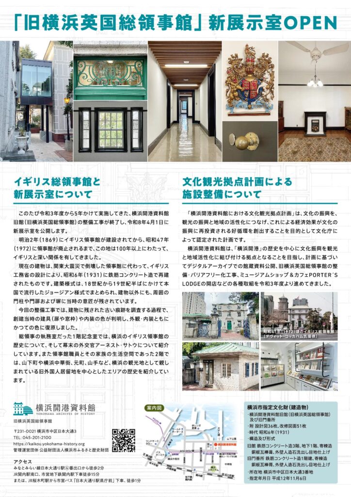 本年4月1日より、「旧横浜英国総領事館」(横浜開港資料館旧館)の新展示室オープンに伴い、新館の企画展示室は常設の展示室3としてリニューアルオープンいたします。
