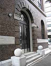 ところが、よく外壁を見てみると、アーチ状の開口部が連続する1階部分、細長い柱型でひとつにまとめられた2階〜4階部分、そして屋上部分と、壁面が三分割されている。この壁面分割は、古典主義様式の伝統的な手法であって、つまり電話局の建物は、形式的には伝統に則っているのである。大桟橋通りに面した玄関のアーチも同様である。キーストーンと持送りの位置に石を用いてアーチの形状を強調し、タイル貼りの部分にも規則的に溝を設けて、あたかも組積造であるかのような表現となっている(図3)。
