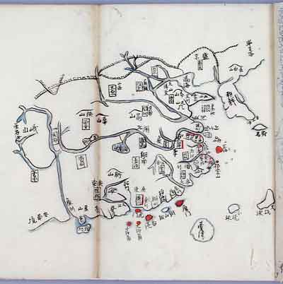 地図のもとになった『海外新話』は、江戸の学者嶺田楓江が嘉永2年(1849)にアヘン戦争の実態を知らせるために刊行したもので、東作は『海外新話』の存在を知り、この地図を写し取ることになった。