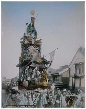 今回発見された着色写真は、本町三丁目神功皇后の飾り人形をもつ山車を撮したものであり、明治23年(1890)11月の帝国議会開設を祝うハッピを着た人々が取り囲んでいる。その一人は「本三」「弁三」と記された棒をもち、運行の指示をしているようであり、人影に隠れて、山車をひく牛が確認できる。運行中の本町の山車の写真はこれが最初である。