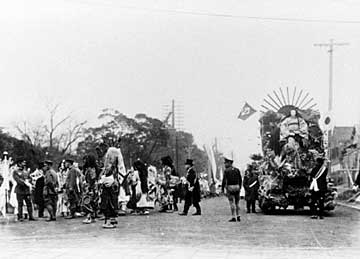 図録『20世紀初頭の横浜』38頁に、大正7年(1918)11月に挙行された第一次大戦戦勝祝賀仮装行列に登場した「天の岩戸」の花自動車の写真が掲載されている。図録編集当時は「似ている」と思いつつも、この人形が一丁目山車の飾り人形であるとの確証はつかめなかった。しかし今は天照大神の飾り人形は、時代が移り、自動車に乗り移って横浜の町を運行したのでは、との思いを強くしている。