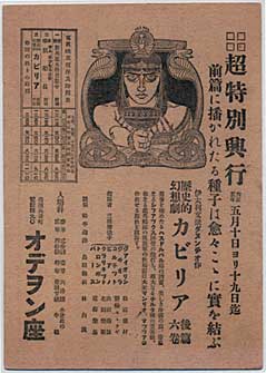 大正5年(1916)4月29日・5月10日に前後編にわたってオデヲン座で封切られたイタリア映画「カビリア」は、3時間半の前代未聞の超大作であった(サイレント映画であることは言うまでもない)。紀元前3世紀頃を舞台とする史劇で、カメラを移動車に乗せて撮影する新手法は、豪壮なカルタゴ大聖殿のセットや入り乱れて闘う群衆シーンをダイナミックに映し出し、圧倒的な迫力を誇った。5月8日の『横浜貿易新報』は、この映画が大作で、興行権が莫大な呼び値であるから、東京では興行されるかどうかわからない。東京で興行されなければ、他都市で興行されるはずもなく、「此大写真を最初に見物の出来た横浜市民は何たる幸福であらう」としている。結局「カビリア」は、天然色活動写真株式会社(天活)が平尾商会から興行権を買い、5月27日帝国劇場を始まりとして公開された。