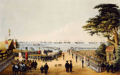 1854年3月8日(安政元年2月10日)、日本の開国を求めて来日したアメリカ東インド艦隊司令長官ペリー提督と将兵たちが横浜に上陸、現在横浜開港資料館があるあたりに設けられた応接所に入り、日米会談が開始されました。