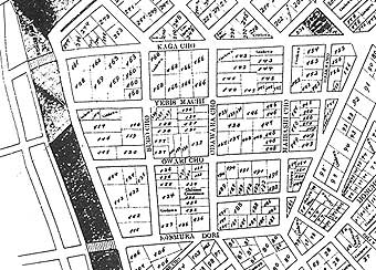 (1)は現中華街大通りで、地図ではMAIBASHICHO、(2)は現関帝廟通りで、地図ではODAWARACHO、(3)は現南門シルクロードで、地図ではHONMURADORIとなっている。この3つの通りと現長安道、地図ではKAGACHOと堀川に囲まれた台形の付近が中華街である。この台形の形は横浜新田の畦道の名残と考えられる。