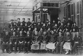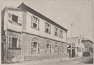 図3は現関帝廟通りから大同学校を撮影した写真である。2階建て校舎の先には、わかりにくいが、黄龍旗と日の丸、「大同学校」の扁額のある正門がみえる。図4は正門を入って校舎の前で撮影した、1920年頃の卒業式の記念写真である。制服姿で卒業証書を手にした生徒と教員が写っている。その背景にある校舎は、外壁は煉瓦、玄関にはポーチがある。航空写真で見ると、玄関のポーチが突き出ているのが確かめられるので、校舎の敷地内の向きがわかる。