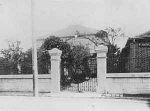 関帝廟通りを下にさがり、(5)の印の建物は駐横浜清国領事館である。1882年8月に落成した領事館で、図6は1910年頃の写真である。門をくぐってすぐ右手に煉瓦の建物、正面に樹木のある中庭、その後ろに正庁があるが、航空写真からもその配置が確認できる。