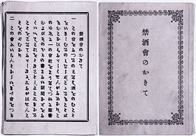 C. Hepburn, 1815〜1911)の日本語教師であり、ブラウン(S. R. Brown, 1810〜1880)から受洗し、日本基督公会の長老となった人物です。そして、横浜禁酒会の規則をまとめたものが、ここで紹介する『禁酒会のおきて』です。そこには、「一、この会をたつるのわけは酒をのむことをいましむるのみなりぞ」で始まる10条の掟が書かれており、巻末には、議長奥野昌綱、副議長牧野鋭吉郎の名が記されています。