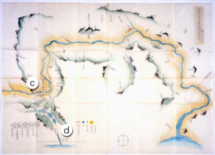 この提案は一旦は聞き届けられたようで、神奈川県は早々に現地の測量を行い、鶴見川・支流沿岸村々の出金高を調査するよう、村々に指示した。また同年11月、神奈川県は民部省宛に、新川と鉄道とが交錯する神奈川宿の滝の橋部分について、新川開削を早期に着工する旨の伺いを提出している(「公文録」2A9公38)。【写真(2)】はこの伺いに添付された付図である。絵図の左端に見える細い線(c〜d)が新川「神奈川川」である。