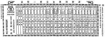 横浜開港資料館では、弥平のご子孫である田島健一氏のご厚意で、所蔵されている文書の調査をさせていただき、一部は複製を作成して公開しています。文書のなかには、東京京橋区にあった広告代理店広目屋の広告と、明治25年12月の「全国各地方新聞広告定価一覧表」、「諸新聞広告定価一覧表」が含まれています。残念ながらこの文書は、当館では公開しておりませんが、貴重な資料なので紹介したいと思います。