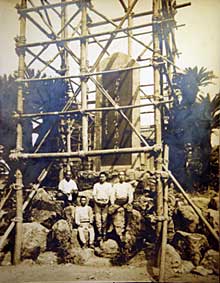 30年以上続いた安藤動物園は、昭和6年にご子息から豊橋市に寄付され、「豊橋市立動物園」となり、昭和9年に向山町字池下に移転する。この移転を機に、昭和11年(1936)、政次郎の遺族が移転前の動物園から移転先に蘇鉄を移植し、その横に「安藤政次郎翁追憶之碑」を建てた。碑は、衆議院議員大口喜六書で、高さ356センチ、幅137センチ、厚さ22センチの御影石でできている。写真4は建立当時の様子である。自然石を積み上げた上に建てられており、碑の両側に蘇鉄が見える。