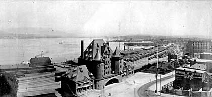 バンクーバーでは初期の都市建設はおもにCPR社をはじめとする民間の地権所有者によって担われた。この点が開港場建設の主体が幕府という公であった横浜と根本的に異なる。図1は1908年の駅周辺の光景である。中央の塔のある建物が駅舎で、一帯には鉄道敷地、波止場、ドックなどCPR社の施設がならび、同社がいかにウオーターフロントの一等地を占有していたかを示している。