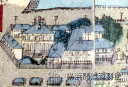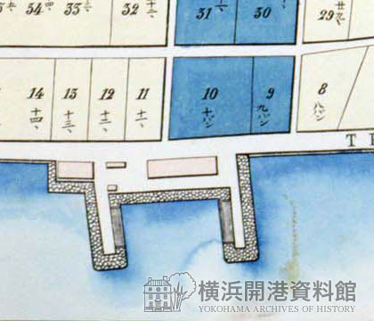 イギリス波止場に近い場所から、居留地1番、2番…と続き20番までが海岸通りをかたちづくりました。この絵図がつくられた明治初年の代表的な外国商人・施設としては、1番がイギリスのジャーディン・マセソン商会①②、2番はアメリカのウォルシュ・ホール商会③、4番はカナダのパシフィック・メール社④、9番フランス海軍病院⑤、11番オリエンタル銀行⑥、18番インターナショナル・ホテル⑦、20番グランドホテル⑧などがありました。居留地10番~12番の先には、フランス波止場⑨⑩があり、イギリス波止場を「西波止場」というのに対して、「東波止場」といわれました。また、海岸通りは石油をともした光⑪⑫が夜の闇を照らしました。