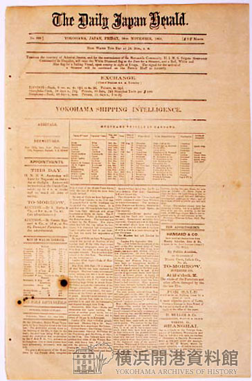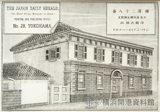 ジャパン・ヘラルドしゃ①は、1861ねん文久元年ぶんきゅうがんねん横浜よこはま最初さいしょ週刊新聞しゅうかんしんぶん「ジャパン・ヘラルド」を、63ねんには日本にほん最初さいしょ日刊新聞にっかんしんぶん「デイリー・ジャパン・ヘラルド」②を発行はっこうしました。会社かいしゃは、何度なんど移転いてんしましたが、この絵図えず発行はっこうされた当時とうじ居留地きょりゅうち60ばんでした。そのほか、「ジャパン・ウィークリー・メイル」や、日刊夕刊紙にっかんゆうかんし「ジャパン・ガゼット」などの外国語新聞がいこくごしんぶん横浜よこはま発行はっこうされています。
