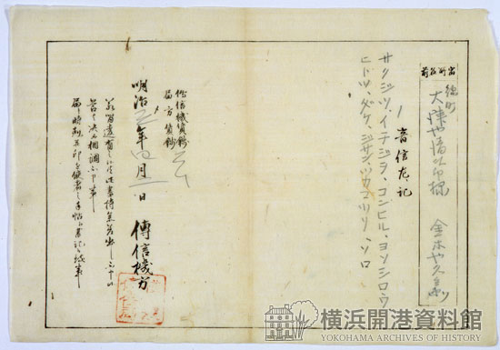 1869ねん明治めいじねん、ブラントンのしんせきであるジョージ・ウォーホップがなかだちやくとなりイギリスから電信技術者でんしんぎじゅつしゃギルバートが来日らいにちしました。横浜裁判所内よこはまさいばんしょない電信機役所でんしんきやくしょ①がおかれて、1870ねんがつ東京とうきょうとのあいだで電報でんぽう②のやりとりがはじまっています。飛脚ひきゃくよりやすくてはやいので評判ひょうばんになりました。