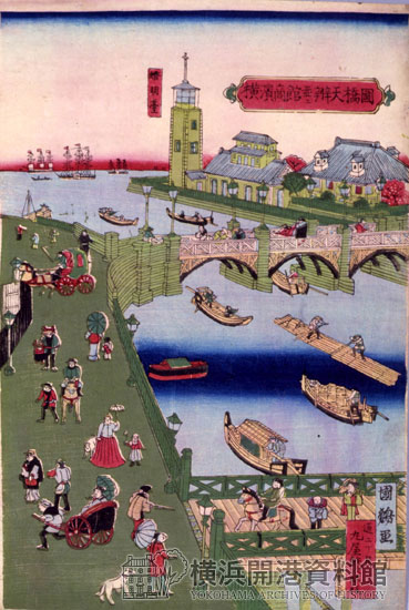 横浜のまちづくりに大きな役割を果たしたイギリス人のブラントンは、もともと船の安全をまもる灯台を全国に建てるために明治政府にやとわれた外国人でした。1869年・明治2年、ブラントンが灯台づくりの拠点とした灯明台役所①には、1873年・明治6年試験灯台がつくられ、全国の灯台につとめる人たちの訓練所となりました。