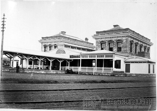 明治政府はイギリスの技術をとりいれて鉄道の建設をはじめます。1871年・明治4年横浜(現在の桜木町)と神奈川のあいだで試験運転がはじまり、アメリカ人ブリジェンスが設計した横浜停車場の建物①が完成しています。翌1872年・明治5年、横浜・品川間の仮営業ののち、横浜・新橋②間は10月14日にすべて開通し、明治天皇が出席して開業式がおこなわれました。