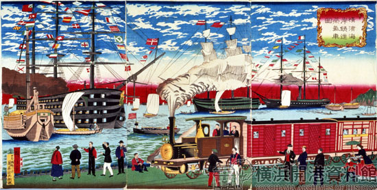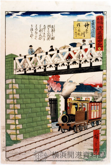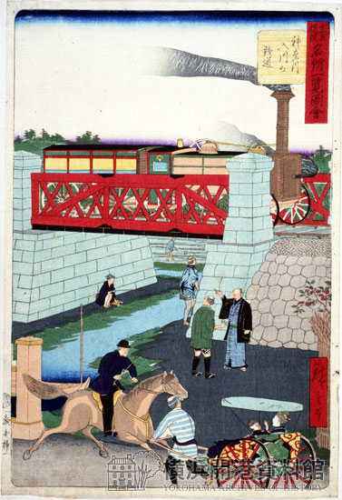 開業当時、横浜から新橋までの時間は53分でした。鉄道開業は、文明開化を代表するできごととして、数多くの浮世絵③④⑤の題材となっています。