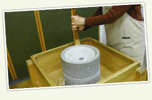 石臼(いしうす)は、石(いし)でつくったひき臼(うす)だよ。上(うえ)と下(した)の臼(うす)を重(かさ)ね合(あ)わせ、上(うえ)の臼(うす)を回(まわ)してそばや米(こめ)などをひいて粉(こな)にするんだ。