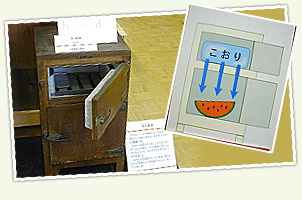 これは、氷冷蔵庫というんだ。まだ、電気が広く利用されていなかったころは、氷を使ってものを冷やしたんだ。