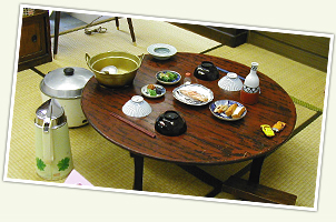 これは、ちょっと昔(むかし)、家(か)族(ぞく)がそろって食(しょく)事(じ)をした食卓(しょくたく)(テーブル)で、「ちゃぶ台(だい)」というんだよ。