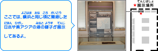 てんじあんない てんじぶつ [地図ちず]19世紀せいき中頃なかごろの開市かいし開港場かいこうじょう[写真しゃしん]長崎ながさき 神戸こうべ 仁川じんせん香港ほんこん 上海しゃんはい[複製ふくせい]開港かいこうを伝つたえる瓦版かわらばん[実物じつぶつ]「御貿易おんぼうえき」の版木はんぎ 19せいきなかごろのせかいじょうせい よこはまかいこうへのみち かいこくぜんや① かいこくぜんや② らいこうしたくろふね かいこく・ペリーらいこう① かいこく・ペリーらいこう② ペリーのかおのいろいろ かいこう ひがしアジアのかいこうじょう かいこうじょうのぜんけいをしめす「ごかいこう よこはまのぜんず」 かわらばん かいこうちょくぜんのようすをしめす「かながわごかいこう よこはま えず」 よこはまのにぎわい ばくまつどうらん けんべいしせつ よこはまいちらんのしんけい