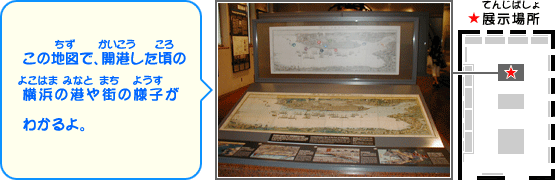 てんじあんない てんじぶつ [絵図えず]開港場かいこうじょうの全景ぜんけいを示しめす「御ご開港かいこう横浜よこはま之の全図ぜんず」[絵図えず]谷戸坂やとざか周辺しゅうへん 西にし波止場はとば周辺しゅうへん 吉田よしだ橋ばし周辺しゅうへん 神奈川かながわ宿しゅくの台町だいまち周辺しゅうへん 19せいきなかごろのせかいじょうせい よこはまかいこうへのみち かいこくぜんや① かいこくぜんや② らいこうしたくろふね かいこく・ペリーらいこう① かいこく・ペリーらいこう② ペリーのかおのいろいろ かいこう ひがしアジアのかいこうじょう かいこうじょうのぜんけいをしめす「ごかいこう よこはまのぜんず」 かわらばん かいこうちょくぜんのようすをしめす「かながわごかいこう よこはま えず」 よこはまのにぎわい ばくまつどうらん けんべいしせつ よこはまいちらんのしんけい