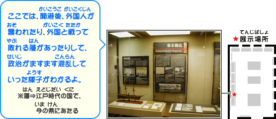 てんじあんない てんじぶつ [写真しゃしん]生麦なまむぎ事件じけんの現場げんば[写真しゃしん]イギリス軍ぐんに占拠せんきょされた長州藩ちょうしゅうはん(今いまの山口県やまぐちけん)の前田まえだ砲台ほうだい[写真しゃしん]「江戸えど」から「東京とうきょう」へ 横浜よこはまに駐屯ちゅうとんした英仏えいふつ(イギリスとフランス)軍隊ぐんたい 19せいきなかごろのせかいじょうせい よこはまかいこうへのみち かいこくぜんや① かいこくぜんや② らいこうしたくろふね かいこく・ペリーらいこう① かいこく・ペリーらいこう② ペリーのかおのいろいろ かいこう ひがしアジアのかいこうじょう かいこうじょうのぜんけいをしめす「ごかいこう よこはまのぜんず」 かわらばん かいこうちょくぜんのようすをしめす「かながわごかいこう よこはま えず」 よこはまのにぎわい ばくまつどうらん けんべいしせつ よこはまいちらんのしんけい
