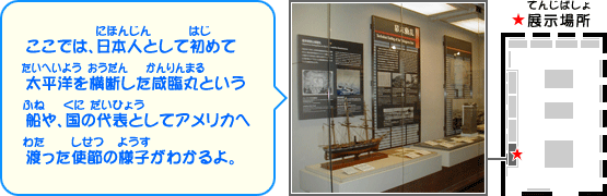 てんじあんない てんじぶつ [絵図えず]咸臨丸かんりんまる難航なんこう図ず [写真しゃしん]ニューヨークの大舞踏会だいぶとうかい人気者にんきものトミー[模型もけい]咸臨丸かんりんまる [複製ふくせい]木村きむら摂津守せっつのかみの渡米とべい記念品 19せいきなかごろのせかいじょうせい よこはまかいこうへのみち かいこくぜんや① かいこくぜんや② らいこうしたくろふね かいこく・ペリーらいこう① かいこく・ペリーらいこう② ペリーのかおのいろいろ かいこう ひがしアジアのかいこうじょう かいこうじょうのぜんけいをしめす「ごかいこう よこはまのぜんず」 かわらばん かいこうちょくぜんのようすをしめす「かながわごかいこう よこはま えず」 よこはまのにぎわい ばくまつどうらん けんべいしせつ よこはまいちらんのしんけい