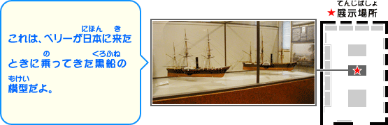 てんじあんない てんじぶつ [模型もけい]サスケハナ号ごう ポーハタン号ごう 19せいきなかごろのせかいじょうせい よこはまかいこうへのみち かいこくぜんや① かいこくぜんや② らいこうしたくろふね かいこく・ペリーらいこう① かいこく・ペリーらいこう② ペリーのかおのいろいろ かいこう ひがしアジアのかいこうじょう かいこうじょうのぜんけいをしめす「ごかいこう よこはまのぜんず」 かわらばん かいこうちょくぜんのようすをしめす「かながわごかいこう よこはま えず」 よこはまのにぎわい ばくまつどうらん けんべいしせつ よこはまいちらんのしんけい