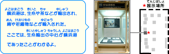 てんじあんない てんじぶつ [絵図えず]生糸きいと売込うりこみ商店しょうてんの店頭風景てんとうふうけい[複製ふくせい]日本茶にほんちゃの商標しょうひょう[実物じつぶつ]町会所ちょうかいしょが発行はっこうした鑑札かんさつ[複製ふくせい]輸出ゆしゅつ生糸きいとのラベル まちはかたる -かいかヨコハマ- ぶんしょにみるよこはましょうにんのかつやく こしゃしんにみるかんないのまちなみ えはがきにみるまちのにぎわい ちずにみるよこはましのけいせい しんぶん よこはましゃしん てつのはし(かねのはし) よこはましやくしょ ちゅうかがい せっけんこうじょう やまてともとまち がいこくじんせんきょうし がいこくじんきょりゅうち おおさんばし うんじょうしょ ぼうえきこうよこはま よこはままいにちしんぶん しんこうふとう よこはまステーション めいじまつねんのよこはまこう