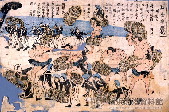 2月26日の第3回目の会談にさきだち、今度は幕府から、ペリー艦隊へ、美術工芸品や米・にわとりなどが贈られ、すもうが披露されました⑥。米だわらを軽々と持ち運ぶ力士に、こんどはアメリカの水兵たちが驚きました。