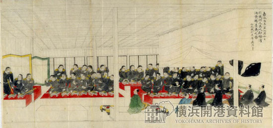 安政元年2月10日(1854年3月8日)、ペリーと幕府役人とのあいだで、条約についての初めての話し合いがもたれました。この日、幕府はペリーやその乗組員に対して豪華な日本料理でもてなしました①。その料理については記録が残っていますが、本膳だけでもアワビの笹づくり・糸赤貝・しらが大根・塩しいたけ・くり・きんかん、などが出されています。日本は肉食を基本的に禁じていましたので、その素材は海産物と農産物でした。ペリーたちが、「おいしい」と思ったかどうかは分かりません。