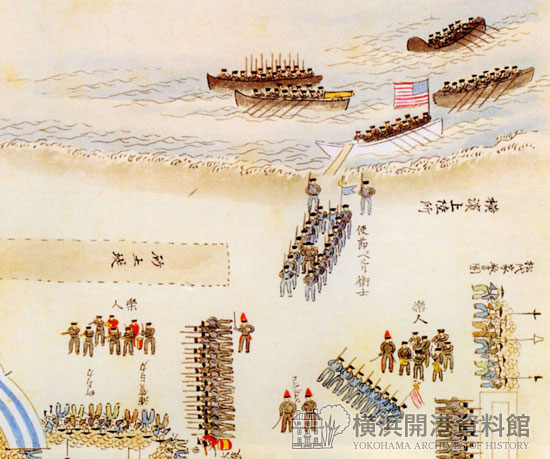 嘉永7年2月10日(1954年3月8日)、日本の開国をすすめるため、ペリーは将兵500名とともに、横浜に上陸しました。その光景を描いた絵には、「楽人」①、つまり音楽隊が描かれています。