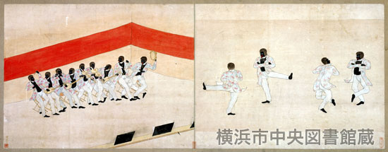 日米和親条約の見通しがついたペリー一行は、2月29日(西暦3月27日)にポーハタン号に幕府役人を招きます。食事のあと、当時アメリカで楽しまれていた「ミンストレル・ショー」が開かれました。