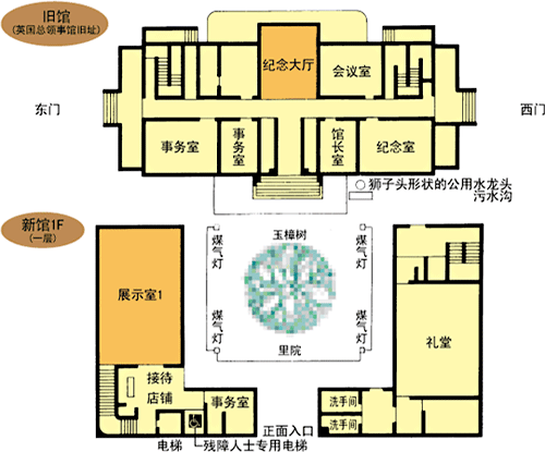 横滨开港资料馆旧馆位于昭和6年(1931年)建成的英国总领事馆旧址,纪念大厅为之前的等候室。现作为来馆者的休息室使用。墙面上以再现庆应元年(1865年)横滨的街道景观的模型图示板为主,揭示有佩里舰队的日本远征航线图,萨英战争中牺牲的英国官兵的铭牌及关东大地震中牺牲的领事馆工作人员的铭牌。